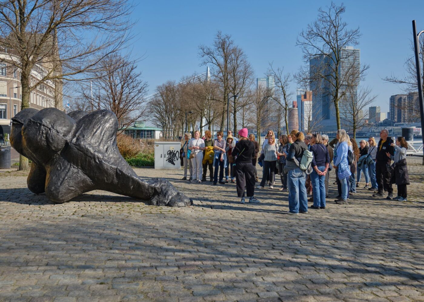 De laatste jaren is daar beweging in gekomen – en die beweging lopen we samen tijdens deze wandeling. Onderweg komen we langs sculpturen, monumenten en muurschilderingen van kunstenaars waaronder Narges Mohammadi, Kalliopi Lemos, Maria Roosen, Hülya Yilmaz, Anne Wenzel en Dalal Mitwally. We staan wat langer stil bij A Minute of Shelter (2025), het nieuwe kunstwerk van Narges Mohammadi op de Coolsingel dat op 25 november 2025 werd onthuld. Het beeld vraagt aandacht voor vrouwen en meisjes die zich in een onveilige situatie bevinden, bevonden of zullen gaan bevinden. Op onze wandeling zien we ook hoe vrouwen zelf worden verbeeld in de kunst en wat dat zegt over macht, zichtbaarheid, kracht en kwetsbaarheid.