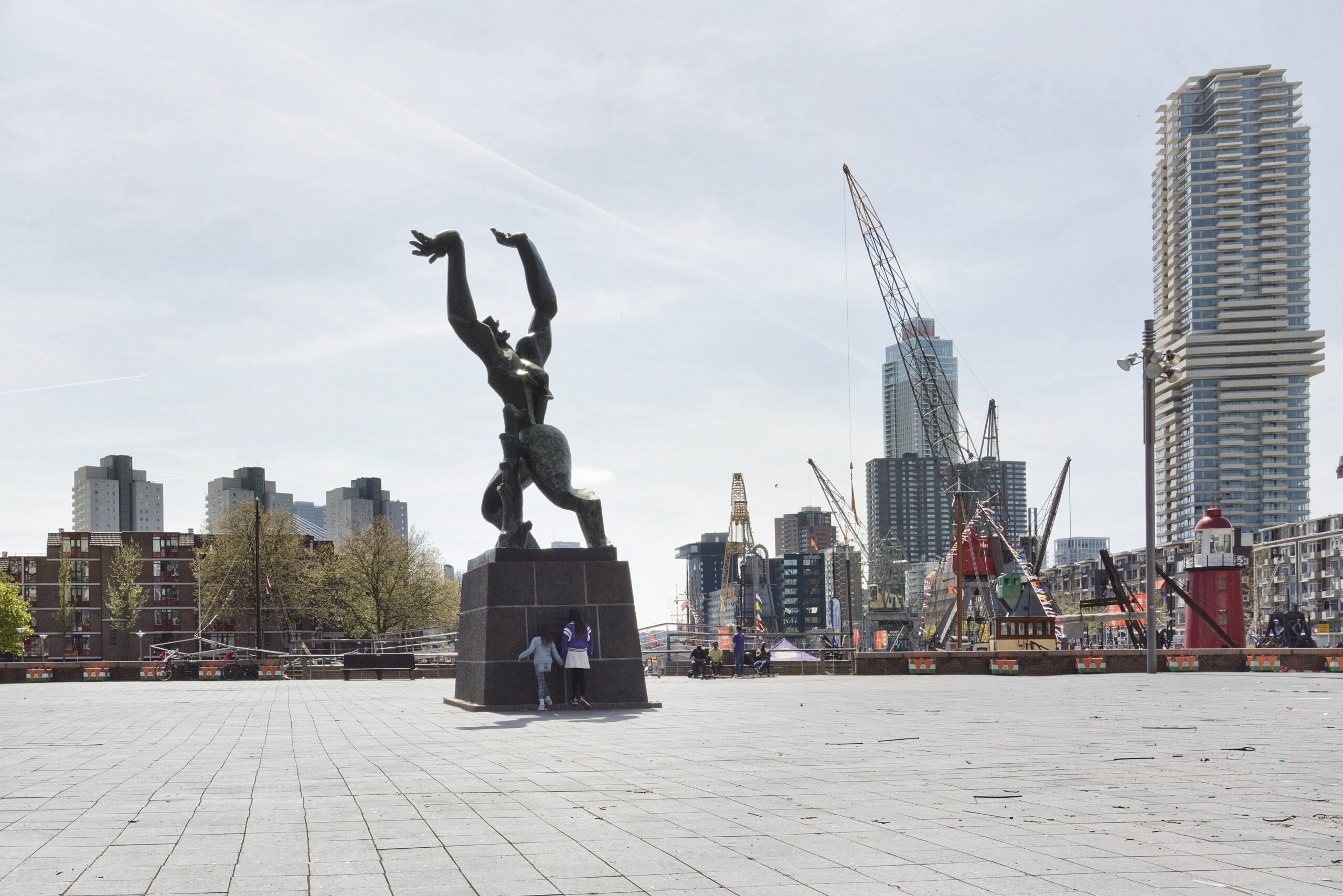 De intentie een emotie over te brengen, is ook van belang geweest voor de keuze van de locatie. In oktober 1950 spreekt Zadkine zich uit voor de kop van de Leuvehaven; de twee andere hem voorgelegde opties waren het park achter Museum Boymans en het Kruisplein. Midden in het centrum en nog niet gehinderd door oprukkende hoogbouw bood de Leuvehaven alle ruimte om de dramatiek van het beeld tot zijn recht te doen komen. Geplaatst op een twee meter hoge sokkel (ontworpen door zijn eens zo felle tegenstander Tillema) tekende de zes meter hoge figuur zich vrij af tegen de hemel en fungeerden de kranen in de haven als echo voor de dramatisch geheven armen. Niet alleen door het motief van de opgeheven armen is Zadkine’s De verwoeste Stad meermalen vergeleken met de Guernica van Picasso uit 1937. Beide kunstenaars zijn er in geslaagd om in het idioom van de moderne kunst op een voor velen overtuigende wijze gestalte te geven aan het drama van de oorlog.