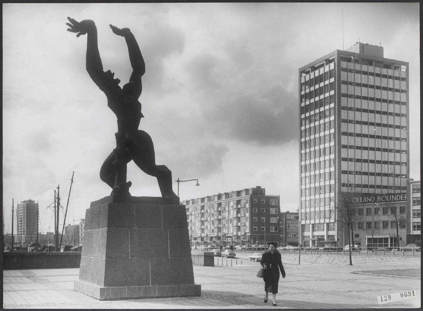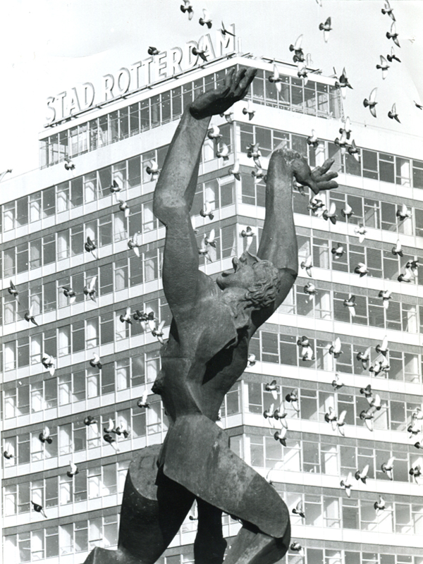 Toch stond Zadkine in eerste instantie een universeler gedenkteken voor ogen. Een in terracotta uitgevoerd ontwerp van het beeld werd in de zomer van 1947 voor het eerst getoond in Praag en Berlijn. Nadat het 70 centimeter hoge beeld tijdens een transport onherstelbaar was beschadigd, vervaardigde Zadkine een nieuwe versie, dit maal van gips. Dit bijna twee maal zo grote beeld maakte deel uit van een solotentoonstelling, die in de zomer van 1948 plaatsvond in Brussel en Amsterdam. Getuige Zadkine’s memoires trok zijn ontwerp in het Stedelijk Museum pas voor het eerst echt de aandacht: “Ik merkte hoe de beleefde waardering –onverschilligheid bijna- die mijn project tot dan toe ten deel gevallen was, plaatsmaakte voor een emotionele reactie door wat men destijds had ervaren.” G. van der Wal, algemeen directeur van warenhuisconcern de Bijenkorf en groot liefhebber van moderne kunst, was zo onder de indruk dat hij het plan opvatte om een monumentale versie van het beeld te schenken aan de stad Rotterdam. In mei 1949 had dit plan zulke vaste vormen dat Zadkine het beeld op zijn overzichtstentoonstelling in het Musée d’Art Moderne in Parijs de titel Ontwerp voor de verwoeste stad Rotterdam meegaf. Om iedere schijn van persoonlijk belang te vermijden bleef Van der Wal (tot 1978) als schenker anoniem. Als voorwaarden voor de schenking wilde hij dat de gemeenteraad unaniem akkoord zou gaan en dat Zadkine zelf de plek voor het monument zou mogen bepalen.