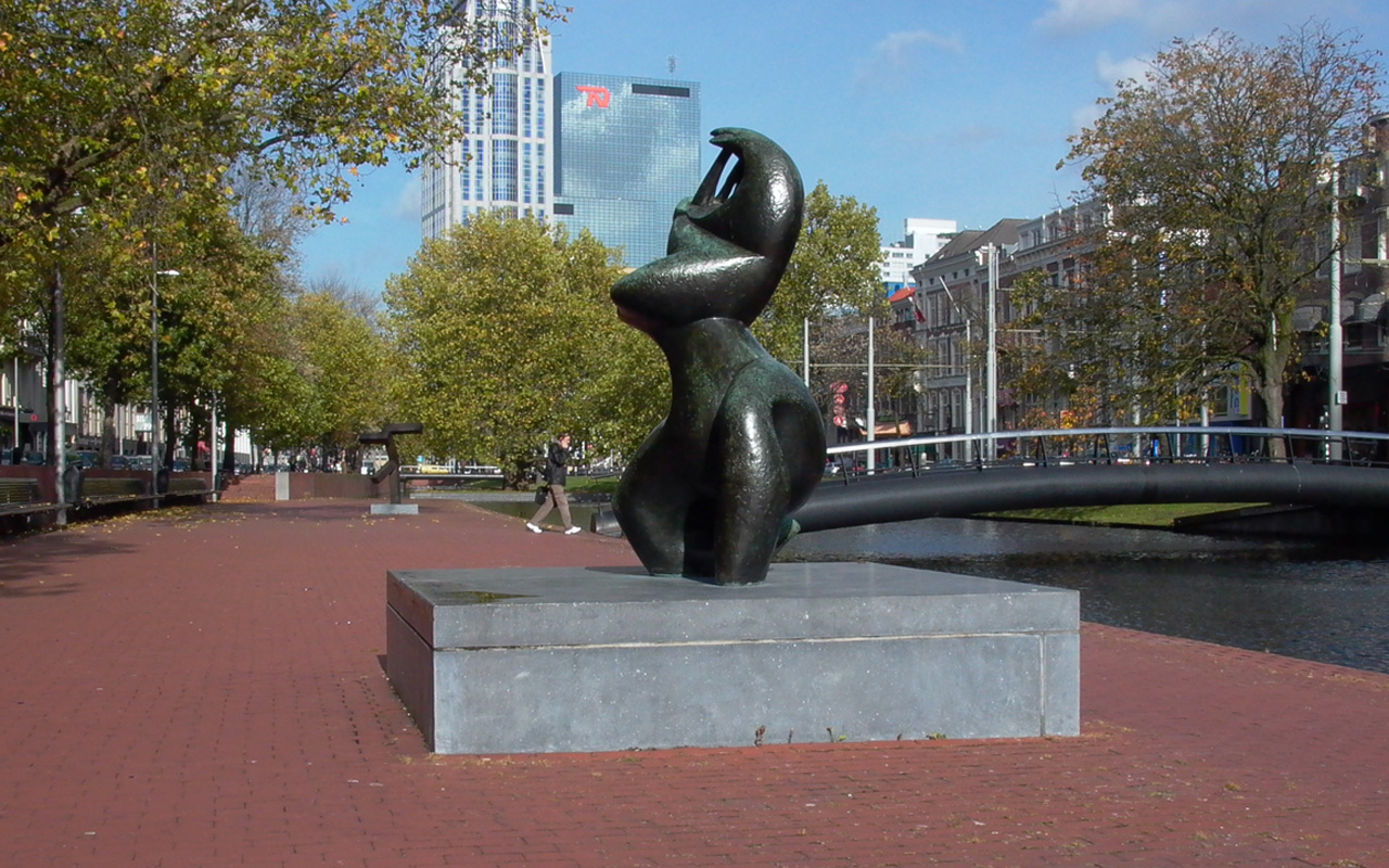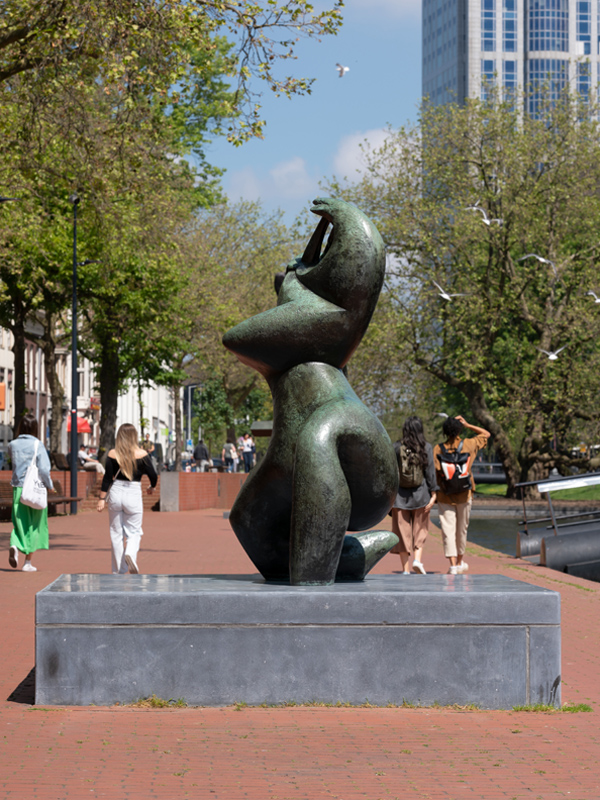 La grande musicienne by Henri Laurens represents a kneeling woman playing a lyre. Laurens made the original plaster sculpture in 1938. The bronze version, which is part of Rotterdam’s sculpture terrace, was cast in 1963. It is now seen as a key work in the artist’s oeuvre and an important example of early cubist sculpture.