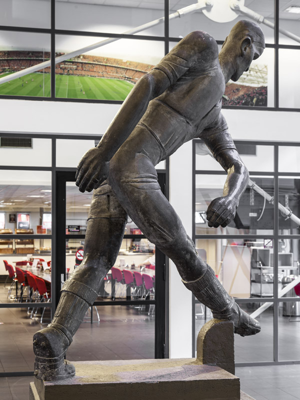 The work had to depict a soccer player and, like the building itself, had to be in concrete. Chabot was given the final go ahead after showing a small model of his design in clay to the stadium board. In retrospect this seems quite remarkable, since the criticism the sculpture received at the opening of the stadium on 27 March 1937 was by no means mild. According to the daily De Telegraaf, ‘a sculpture of a handsome and healthy man’ would have been more appropriate instead of this ‘sick person’. A Rotterdam newspaper published an epigram that ended with the lines: “There it will stand, until human mortals / even in art, court the truth once again / And beat this hard piece of mockery a lot / One day that may be its fate! / til then, Chabot”. Criticism was chiefly aimed at the primitive appearance of the ‘awkward and degenerate’ sports figure. Notwithstanding its two-metre height, it has a stocky build, chiefly because of the disproportionately broad shoulders and thick underarms. Anatomical details like the leg muscles, knees and face are unrealistic and rudimental. Where other sculptors would probably have taken a leg hurling forwards as a starting point for a dynamic twisting torso, as in a corkscrew-like movement, Chabot did exactly the opposite: the figure is twisting the other way. In fact he has depicted two moments from a typical movement when taking a shot. The strangely contorted upper body is poised for a vigorous effort, while the straight right leg indicates the shot has already been taken. However, Chabot’s main aim was to show a complex formal interplay of opposing diagonals, which, in fact, characterizes this statue. But due to the long, narrow head, obvious scowl, too large ears and an eye-less face rigidly focused on an absent ball, his contemporaries mainly saw the sculpture as a complete caricature of a soccer player.
